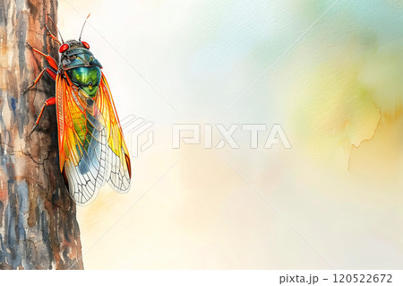 Watercolor drawing with a cicada sitting on a plane tree branch, space for insect ideas, bright colorful background