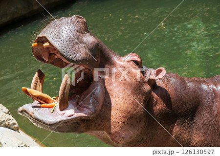 Hippopotamus open mouth and beg for food from traveler in zoo