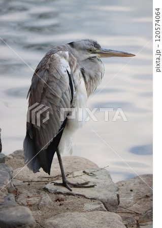 公園の池のほとりで休息をとるアオサギー五