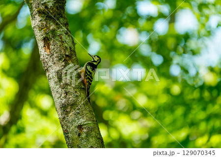緑の森で採食するアカゲラ