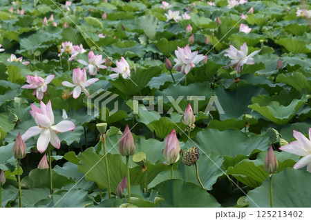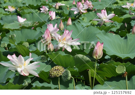 それぞれの花が個性的な咲き方をする篠山城蓮