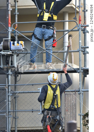 マンション大規模修繕 とび職人 仮設足場組立工事の作業風景