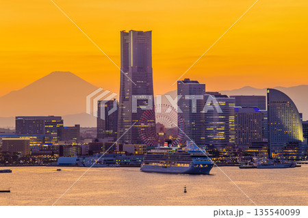 日本の横浜都市景観飛鳥Ⅱや富士山、横浜みなとみらいなどを望む