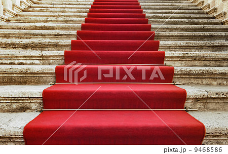 Stairs 3d with red carpet. Vector scarlet floor staircase for celebrity or stairway up to success