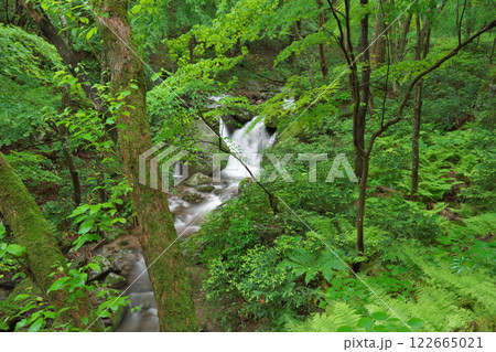 雨に濡れた新緑の森を流れる清流(大万木山付近:飯石郡飯南町)