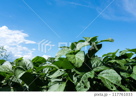 大中干拓地に広がる大豆畑と夏の空のコピースペース