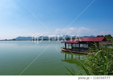 広角レンズで撮る晩夏の西の湖と青空のコピースペース