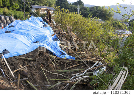 土砂崩れ現場と瓦礫、愛知県蒲郡市竹谷町大久古、日本