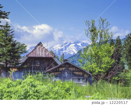 山形県西川町大井沢集落から望む残雪の霊峰月山と姥が岳の風景