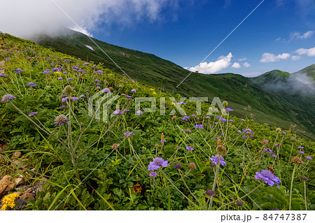 マツムシソウ咲く日暮沢の登山道から見る朝日連峰主稜線