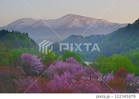 快晴の朝空と残雪の月山を背景にした山形県西川町大井沢の桜 Ver1