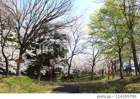 早春の新潟県十日町市大井田の郷公園の桜風景