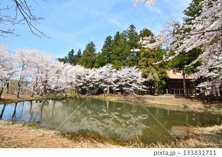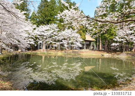 新潟県十日町市大井田の郷公園の桜・四日町神宮寺観音堂山門風景