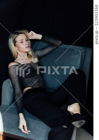 Beautiful blonde woman in black fashion suit
