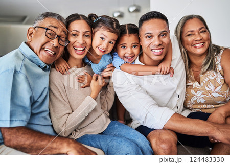 Relax, happy and portrait of family on sofa for bonding, quality time or smile together. Hug, silly and care with parents affection with children in living room at home for lounge, content or support