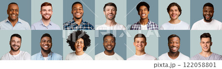 Set of happy multiracial people men smiling on blue studio backgrounds, panorama. Collage of portraits of candid handsome and cheerful young african american and caucasian guys posing at studio