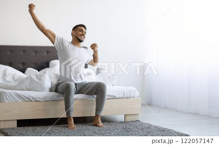 Good Morning. Happy Millennial Arab Guy Sitting On Bed And Stretching After Good Sleep, Handsome Smiling Young Middle Eastern Man Relaxing In Cozy Bedroom, Enjoying Home Comfort, Copy Space