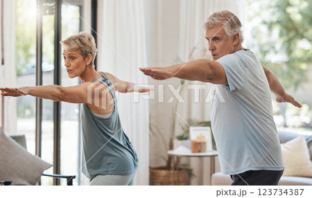 Senior couple, exercise and fitness during aerobics or yoga workout in the lounge at home for health and wellness in retirement. Old man and woman stretching for healthy lifestyle in Australia house