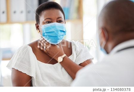 Black woman, sore throat and face mask, doctor and patient in hospital, medical examination and symptoms. Healthcare, virus with covid and communication, people in clinic with health insurance