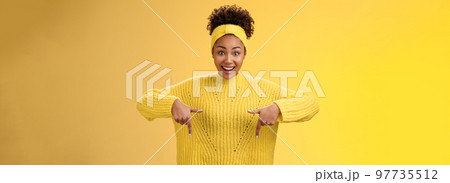 Enthusiastic impressed surprised beautiful african-american woman widen eyes drop jaw smiling gasping astonished pointing down amused standing yellow background showing amazing opportunity