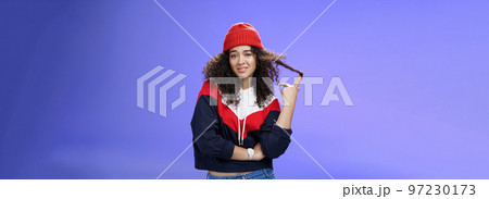 Stylish and snobbish arrogant curly-haired woman in warm beanie rolling curl on finger smirking and looking with contempt at camera, scorning person as being too cool over blue background