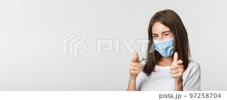 Covid-19, health and social distancing concept. Sassy smiling brunette girl in medical mask winking flirty at camera and pointing fingers