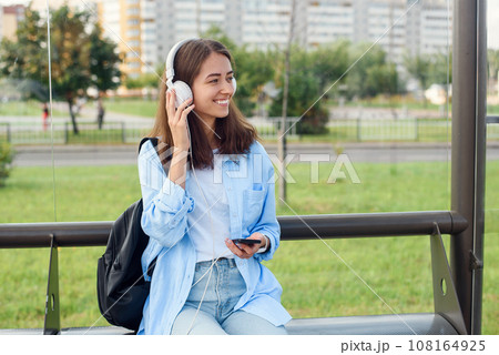 Teen girl listens to the music by white headphones in a public transport station while she waiting for tram.