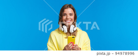 Waist-up portrait good-looking blond girl in yellow hoodie promote smartphone application, show mobile phone display and smiling camera as recommend subscribe or download app
