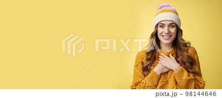 Touched happy charming caucasian girlfriend receive moving cute gift press palms chest thankful, smiling grateful appreciate lovely gesture, standing delighted joyful yellow background