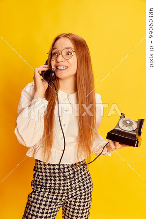 Young happy girl with red hair wearing office style clothes talking on retro vintage phone over yellow background. Concept of youth, student college life, business and education.
