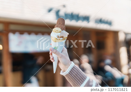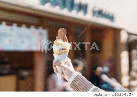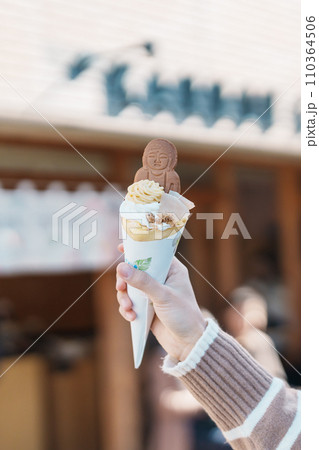 Woman showing Daibutsu or Buddha yogurt crepe, popular dessert in Kamakura, Kanakawa, Japan