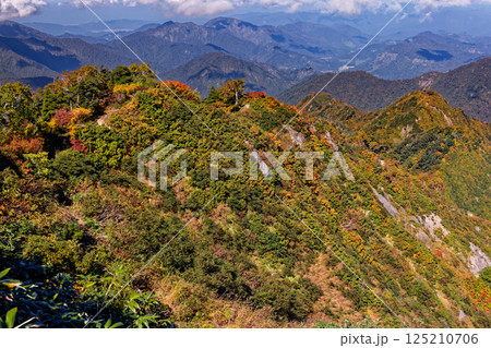 宝珠山から見下ろす紅葉の飯豊連峰・ダイグラ尾根