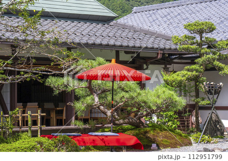 京都市 三千院門跡 夕暮れ時の大原温泉芹生(せりょう)と野点傘