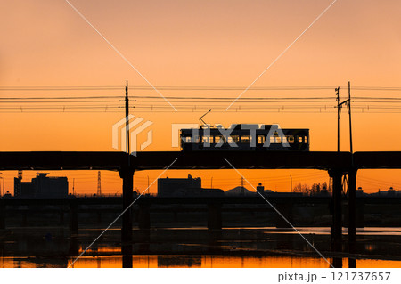 川を渡る路面電車の風景