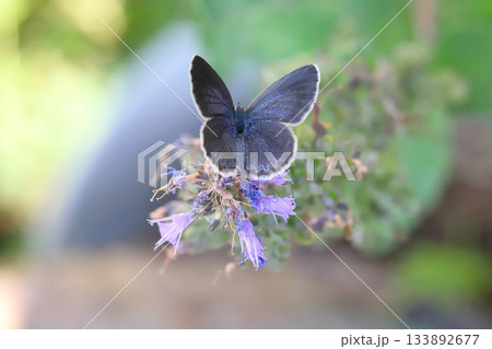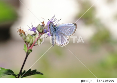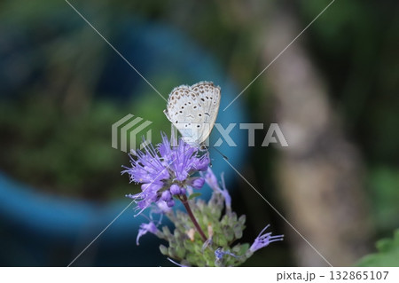 秋の庭に咲く紫色のダンギクの蜜を吸うヤマトシジミ蝶