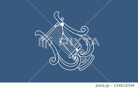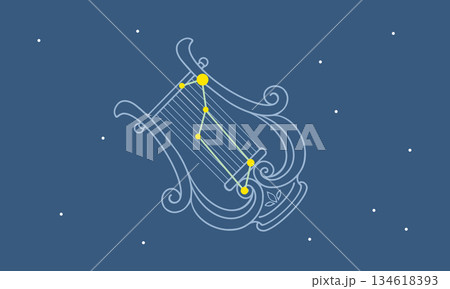 ネイビー色の背景に浮かぶ琴座のイラスト(琴の絵とゴールド色の星座線)