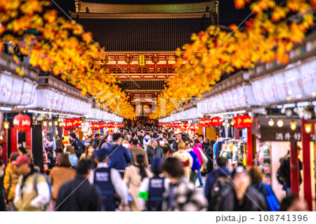 日本の東京都市景観 11月。外国人で賑う浅草寺。脱コロナのはずだが、再びマスク姿の日本人も=13日