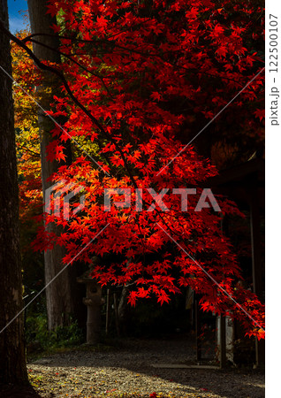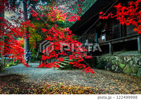紅葉が美しい秋の境内、もみじ三山の里、11月21日、日本