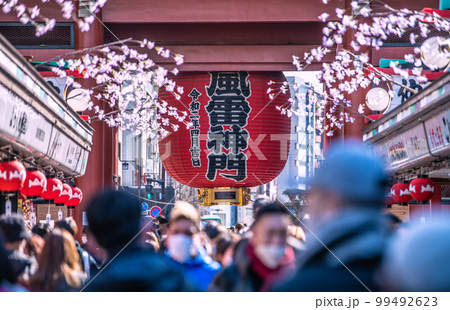 日本の東京都市景観 外国人観光客で賑わう浅草寺。コロナ禍前のような人出。屋外等マスク不要=2月22日