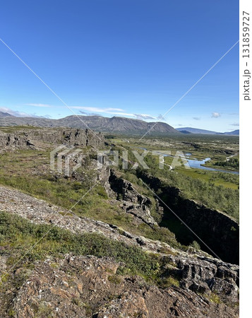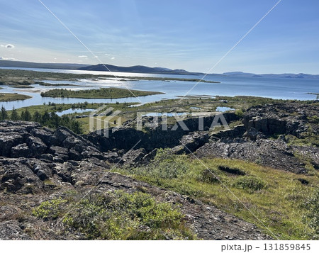 アイスランドの世界遺産、シンクヴェトリル国立公園の大地の裂け目の岩と湿地帯です。