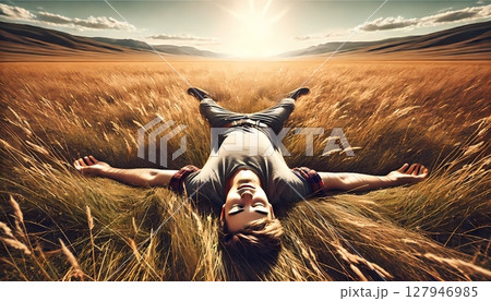 太陽の光を浴びながら大地に寝そべる男性の姿