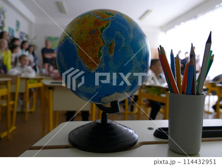 Earth Globe and colored pencils on the desk near the blackboard in front of the schoolchildren at the lesson