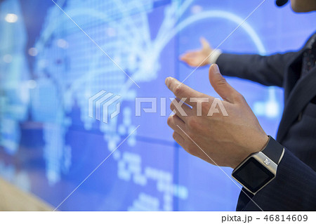 プレゼンテーションイメージ 巨大モニターの前でプレゼンをするビジネスマン手元