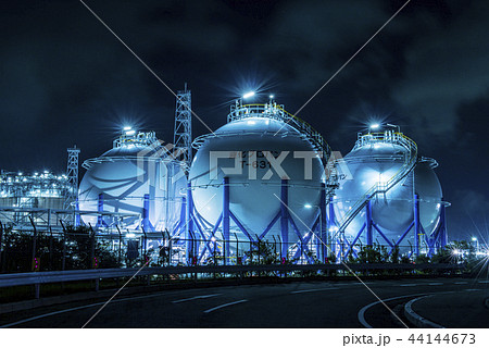 液化天然ガス(LNG)を貯蔵している大型LNGタンクと球形タンク(エネルギーイメージ)
