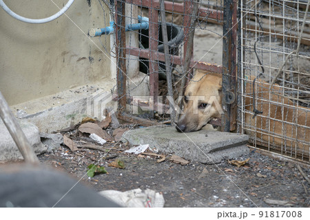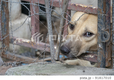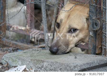 sad brown Thai dog showing the unhappy from its eye. It's in the old cage.