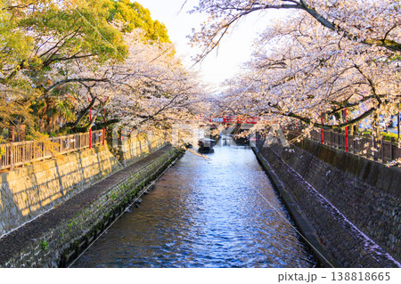 桜咲く大垣市の水門川の夜景