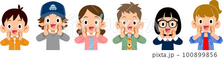 呼びかける六人の小学生男女の上半身
