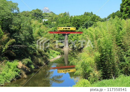 いすみ鉄道「夷隅川と鉄橋を渡る列車」大多喜城を背景に