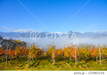 北アルプスと雲海とワイン用ブドウ畑【北安曇郡池田町】