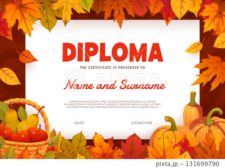 Fall season kids diploma with falling autumn leaves, orange pumpkins and fruits basket with apples and pears. Vector certificate template. Child award border for participation, achievement, graduation
